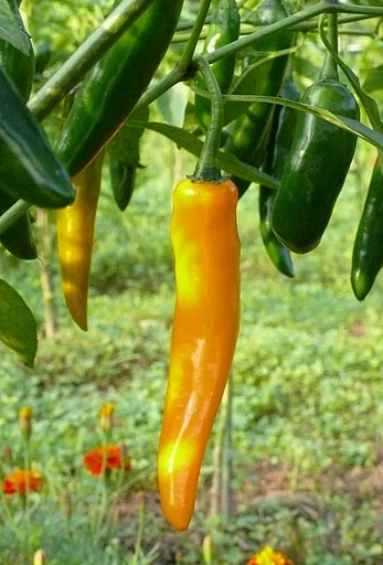 Orange cayenne is a hybrid chilli pepper. It is a Cayenne variety with attractive glossy orange fruits at maturity. Fruits are pendant-shaped and a little more rounded at the base than Golden cayenne .[ 1]