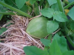 The plant is very compact and bushy, rather than vining. Each plant should grow about 2-3' tall with only about a 4-5' spread. The fruits are mature when they reach about 1 lb, so 2 people can split one with no leftovers.