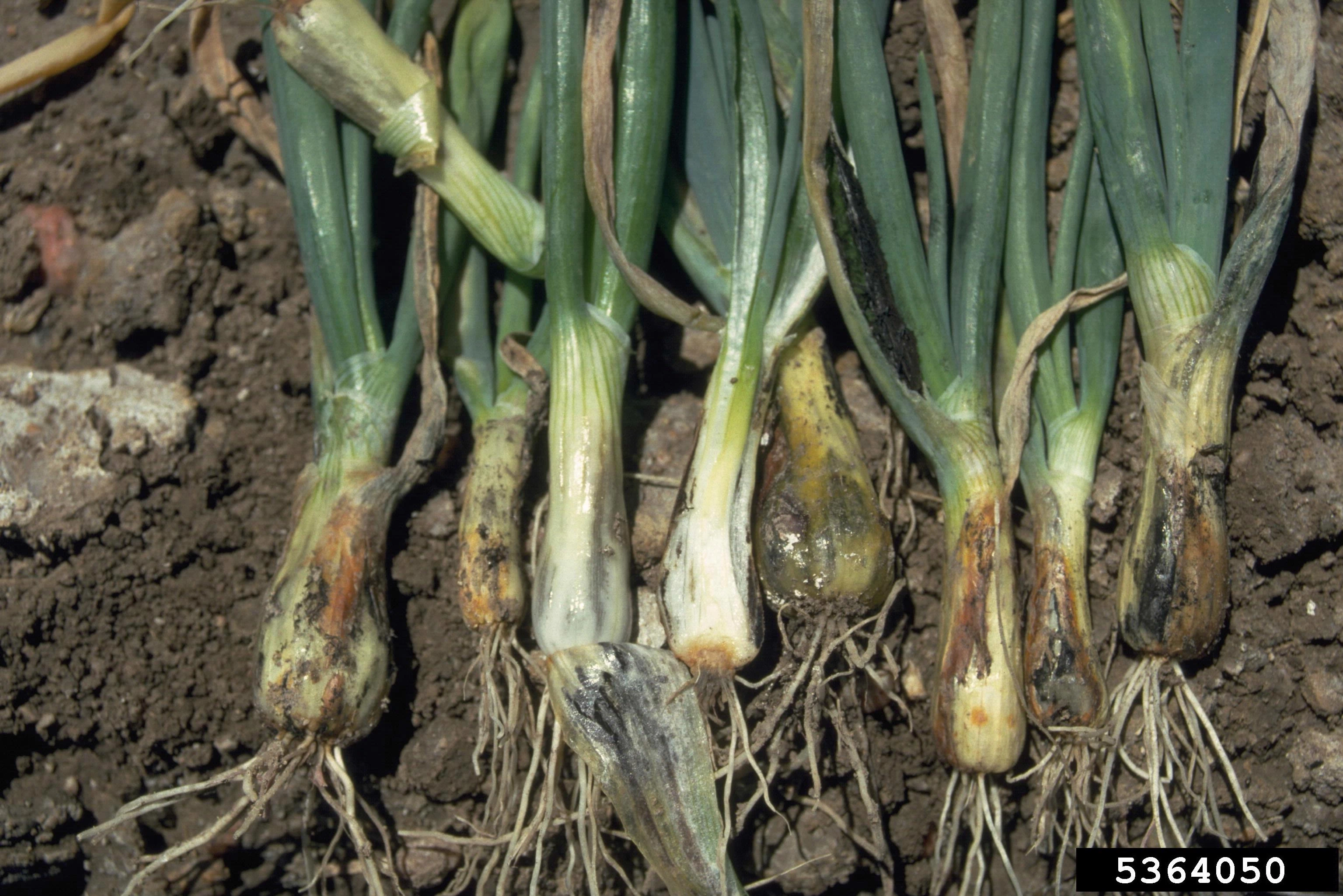 When the plant grows lesions form on the leaf and any bulbs that form will be covered in black spots. Most of the time infected seeds will die within 3–5 weeks of planting.[1]