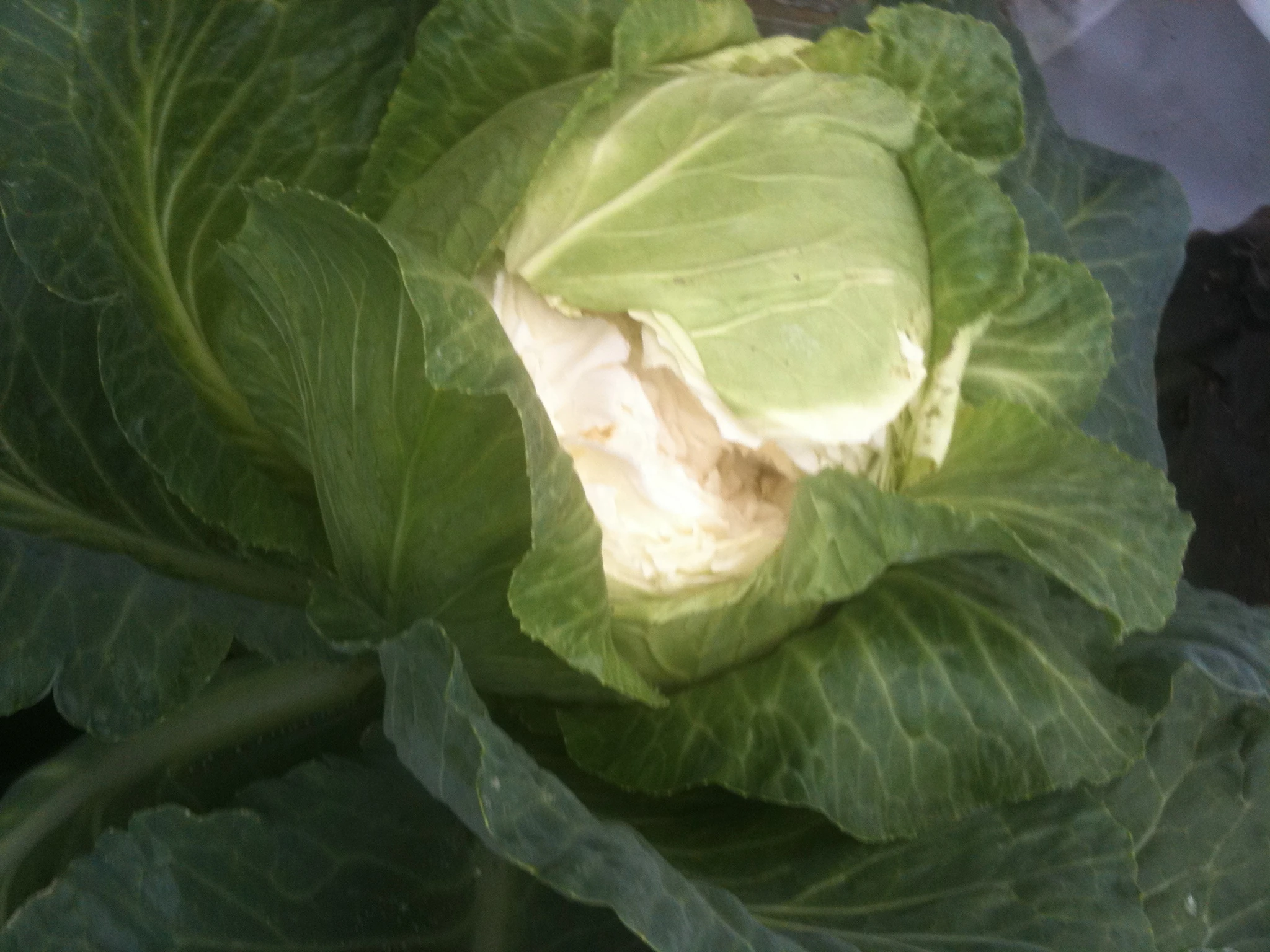 Cabbage can be harvested anytime after the heads form. For highest yield, cut the cabbage heads when they are solid (firm to hand pressure) but before they crack or split.[1] Foliar feeding at the first sign of trouble helps to harden the leaf tissue, but it is better to prevent trouble by watering regularly during drought.[2]